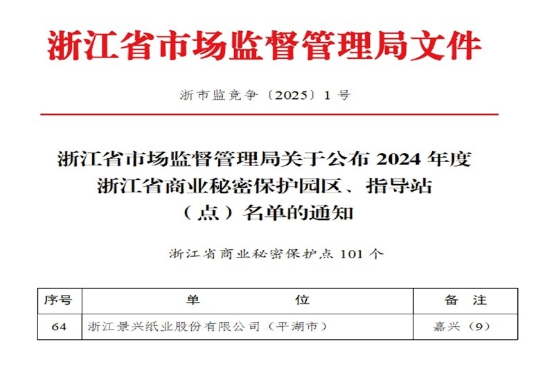 近日,浙江省市場監督管理局揭曉2024年度浙江省商業秘密保護園區、指導站(點)的名單,浙江景興紙業股份有限公司憑借其出色的商業秘密保護工作,成功躋身榜單,成為平湖市獨攬此殊榮的佼佼者。